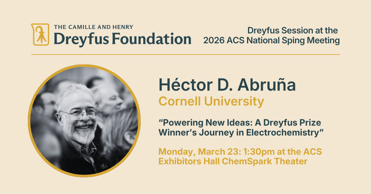 This session, sponsored by the Camille and Henry Dreyfus Foundation and moderated by its President H. Scott Walter and Chair of the Scientific Affairs Committee Milan Mrksich (Northwestern University) will feature a fifteen-minute presentation followed by a thirty-minute audience discussion. Abruña is the 2025 recipient of the Dreyfus Prize in the Chemical Sciences, the Foundation’s highest honor.