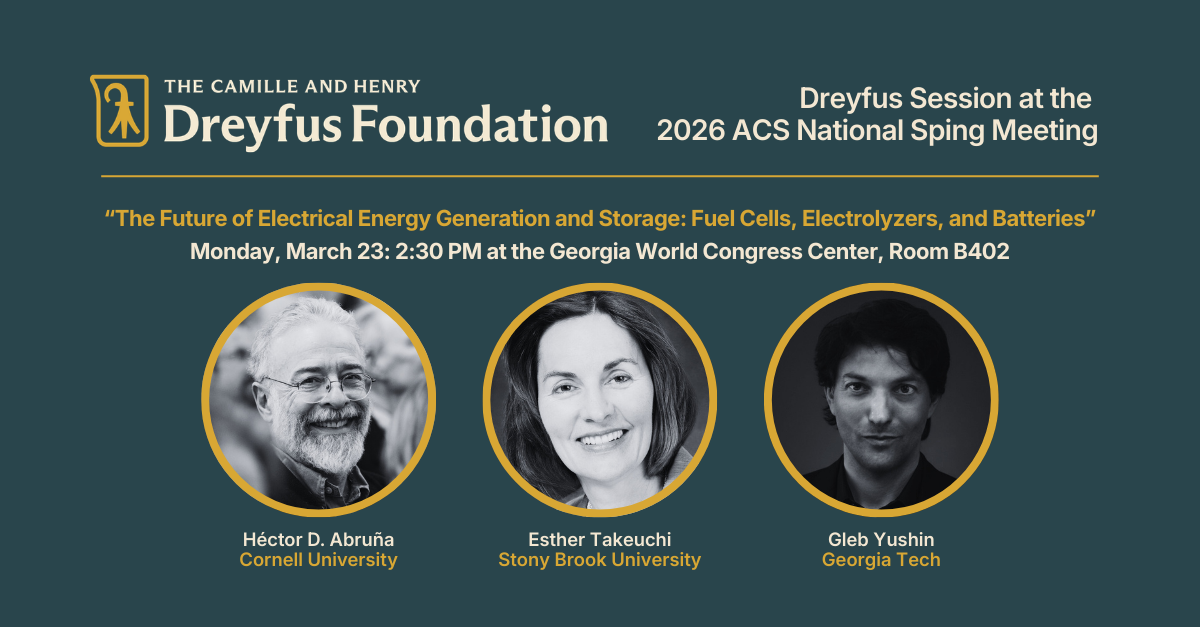 The Dreyfus Foundation has organized two sessions at the American Chemical Society (ACS) Spring Meeting in Atlanta, Georgia on March 23, 2026. Both sessions will focus on electrochemical processes – the topic of the 2025 Dreyfus Prize. These sessions are open to all attendees of the Meeting.